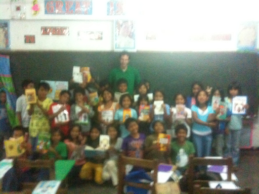 "After several classes, my voice was getting a little dry from my animated readings. So, I decided to try something else. I brought the entire box up and handed the books out to all the pupils. Amazing! Despite the random distribution, the kids fell I to a rapt silence-- they devoured with their eyes and fingers the beautiful pictures, words and photos. I might as well have been handing iPads out to a class of Canadian students! "